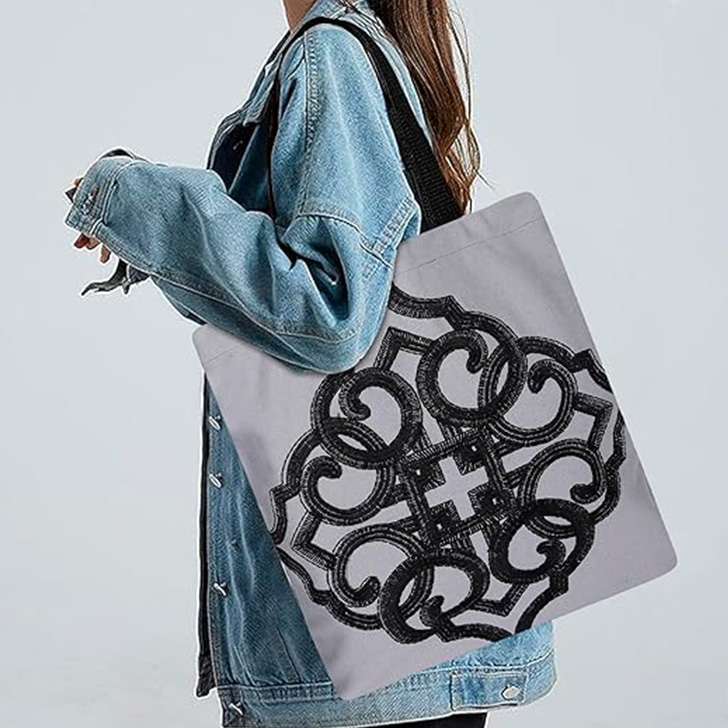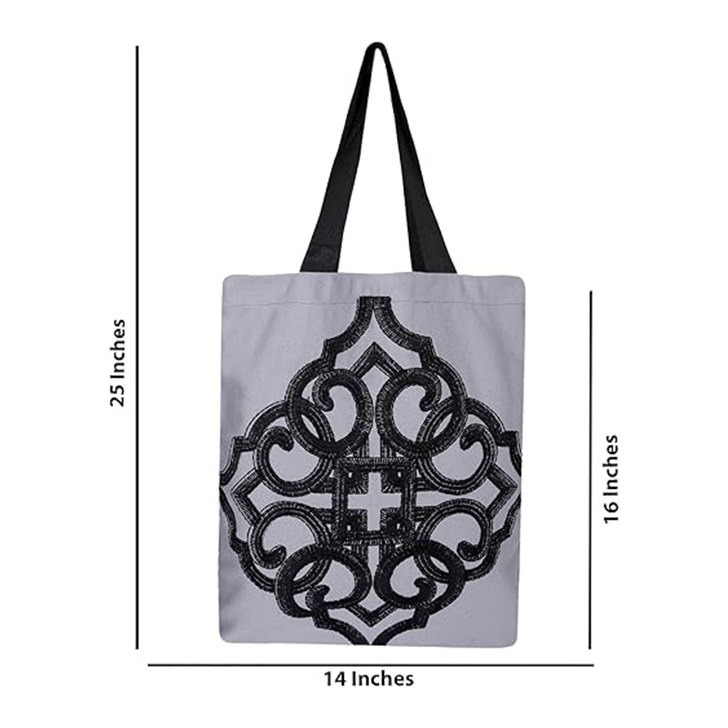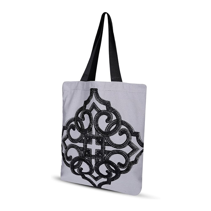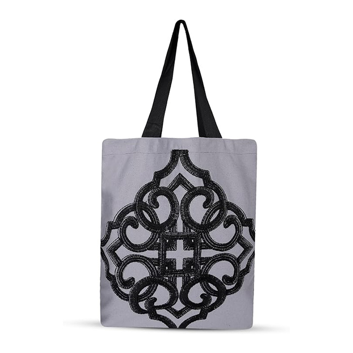 • Stylish Design: This tote bag features a striking black embroidered pattern on a light gray canvas material, adding a touch of elegance to your everyday carry.